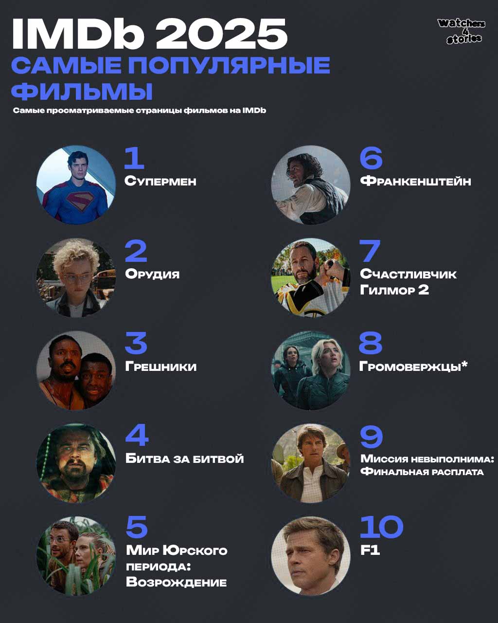 Список из 10 самых популярных фильмов года составлен на основе того, какие фильмы пользователи IMDb чаще всего искали и просматривали на сайте в течение всего 2025 года. Чем больше просмотров страниц у фильма, тем выше он в рейтинге.
